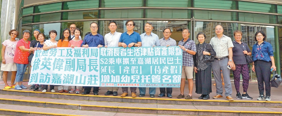 有中產長者表示,一生人辛勞工作及盡責交稅,節儉儲錢老來才有些少積蓄棺材本,卻因此未能取得高額長者生活津貼,感到非常不公及被懲罰,要求取消長者生活津貼的收入資產限額,再由政府注資設立資金池,推動全民退休保障制度;另有麗湖居街坊希望長者2元乘車優惠可擴至嘉湖山莊居民巴士,方便他們擴闊生活圈子。
