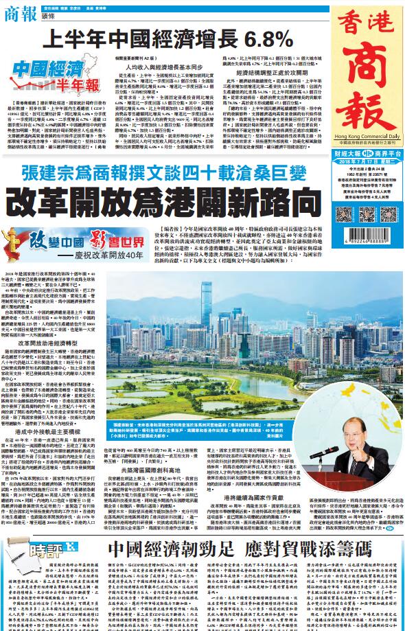 【編者按】今年是國家改革開放40周年,特區政府政務司司長張建宗為本報發來專文,不僅盛赞國家改革開放四十載成就輝煌,亦傳達這40年來香港乘着改革開放的洪流成功實現經濟轉型,并因此奠定了亞太商業和金融樞紐的地位。張建宗還指,未來香港將繼續盡己所長,服務國家所需,做好國家與環球經濟的橋梁,積極投入粵港澳大灣區建設,努力融入國家發展大局,為國家作出新的貢獻。以下為專文全文(標題與文中小題均為編輯所加):