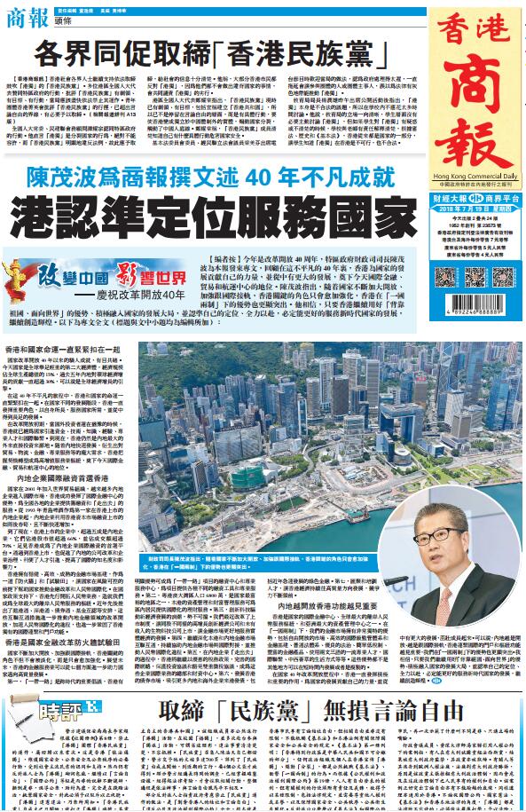 在國家40年改革開放歷程中,香港一直發揮積極和重要的作用,為國家的發展貢獻自己的力量,并從中有更大的發展,茁壯成長起來。可以說,內地越是開放、越是跟國際接軌,香港連繫國際的門戶和樞紐功能越見重要,我們在「一國兩制」下的優勢也更顯突出。我相信,只要我們繼續用好「背靠祖國、面向世界」的優勢、積極融入國家的發展大局,并認準自己的定位、全力以赴,必定能更好的服務新時代國家的發展,繼續創造輝煌。