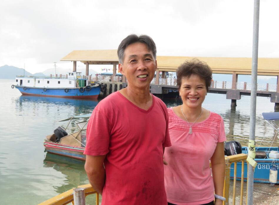 經營食肆的吉澳村代表劉子安(左)指首航日生意好了幾成,旁為太太。