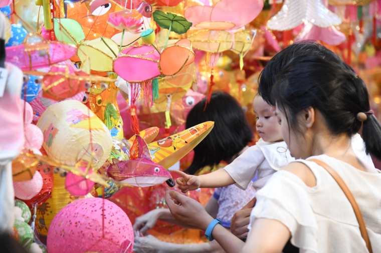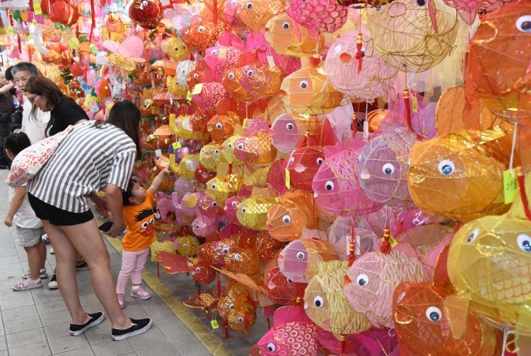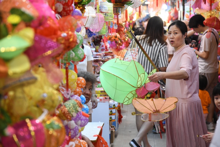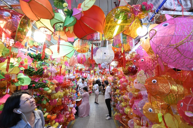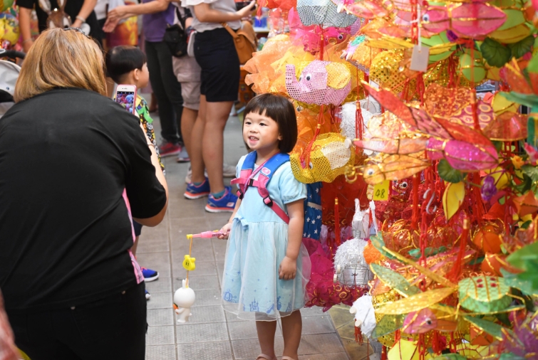 香港中秋節慶自然少不了燈籠助興,元朗大橋街市(元朗政府合署)有一條小小「燈籠街」,店東應市燈籠再次迎接市民的到來。甫入10餘米的街舖長廊便被眼前五光十色的燈籠所包圍,恍如踏入一條「燈籠隧道」,中秋前夕晚上6時後的收工時段,賞燈、買燈的市民絡繹不絕,皆因該處燈飾集中、花款種類多,數量過千。今年燈籠花款仍然主打傳統的白兔、鯉魚、楊桃等,燈籠選料有玻璃紙燈籠,亦有布織、紙紮的燈籠,到來的市民有的「打卡」,亦有選完A款再要B款的買家,市民和店東忙得不亦樂乎,身處「燈籠街」,已提前感受到中秋佳節的氣氛。