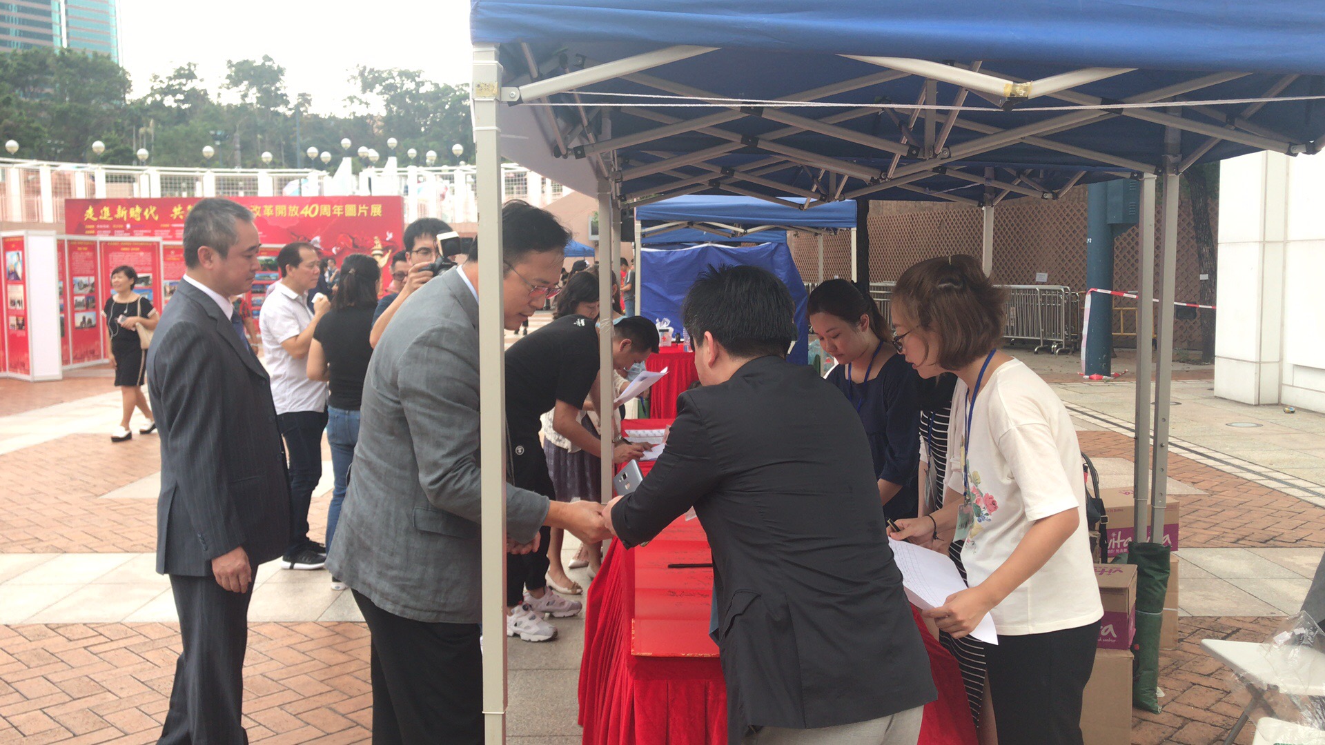 中联办宣传文体部副部长罗江到场(左二)、香港商报执行总编辑刘晓东(左一)迎接。