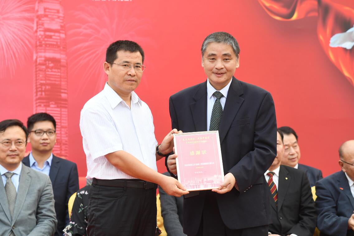 本報總經理張介岭(右)向贊助機構河南省廷懷玉青白胎瓷工程技術開發有限公司代表(左)頒發感謝狀。記者 馮俊文攝