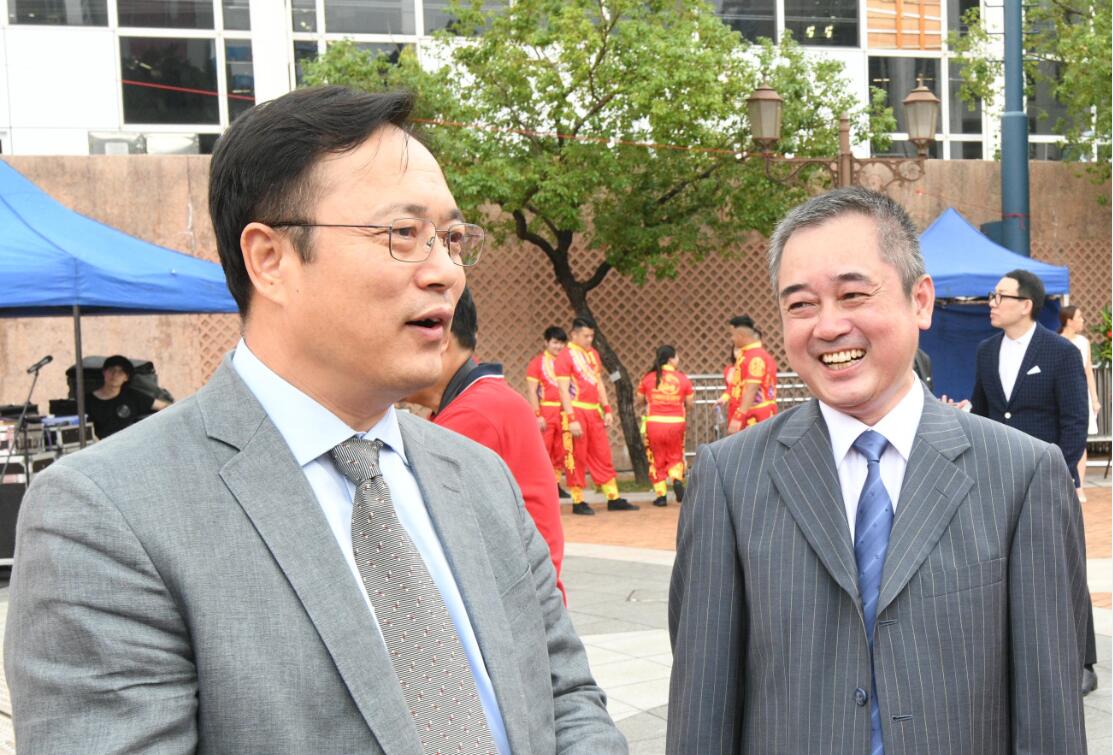 中聯辦宣傳文體部副部長羅江(左)與本報執行總編輯劉曉東(右)喜相逢。 記者 馮俊文攝