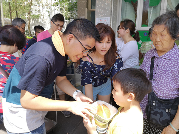 譚榮勳議員(左)和義工們在富亨邨派發飯盒。