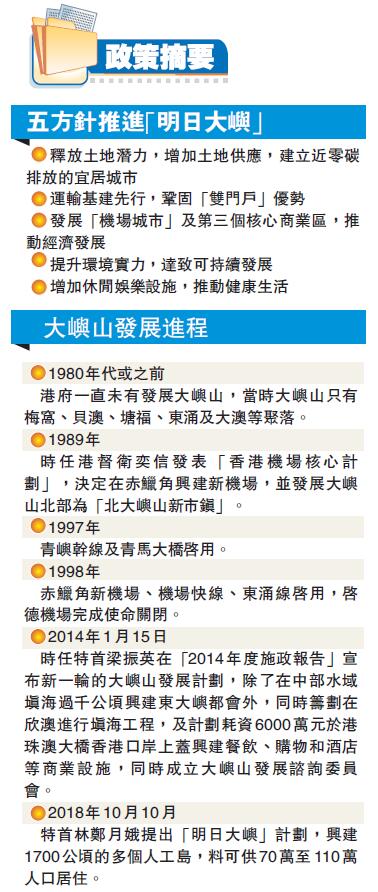 今天的交椅洲及喜靈洲分別只是無人島嶼及懲教所,但2030年後該區不僅提供26萬至40萬伙住宅單位,更有望成為繼中上環及九龍東後,香港第三個核心商業區。填海後的中部水域人工島,預料可提供70萬至110萬人口居住,其中七成為公營房屋。林鄭月娥強調,「明日大嶼」是本屆政府的重點工作,政府將盡快成立專責統籌辦事處,統籌並監察項目規劃,未來按需要擴展。