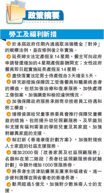 【香港商報訊】記者黃雪峰報道:行政長官林鄭月娥任內第二份《施政報告》對勞工福利着墨不少,強調良好的勞資關係和與各階層分享經濟增長成果是具包容性的社會的重要元素。她說,雖然本港現時的失業率為逾20年來最低水平,但不少行業的僱主仍慨嘆請人困難,必須從多方面手,除釋放本地勞動力外,亦要適時輸入所需人才與勞工。