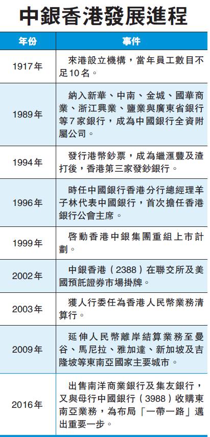不僅是擔當內地銀行來港上市的先行者,過去10多年,中銀香港在香港發展離岸人民幣業務方面,同樣成為「排頭兵」。2003年11月,國務院批准香港試辦個人人民幣業務後,中銀香港2003年獲人行委任為香港人民幣業務的指定清算行。及至2009年,中銀香港成功延伸人民幣離岸結算業務,至曼谷、馬尼拉、雅加達、新加坡及吉隆坡等東南亞城市和國家。