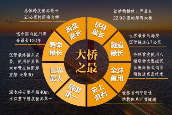 中国港珠澳大桥是全世界跨度最大、钢结构桥体和海底沉管隧道最长、40m水深整平精度第一的跨海大桥;它是国内首例设计使用寿命达120年的跨海大桥;它是世界沉管隧道史上首次提出并应用半刚性结构体系的跨海大桥。中国“智造”震惊世界。