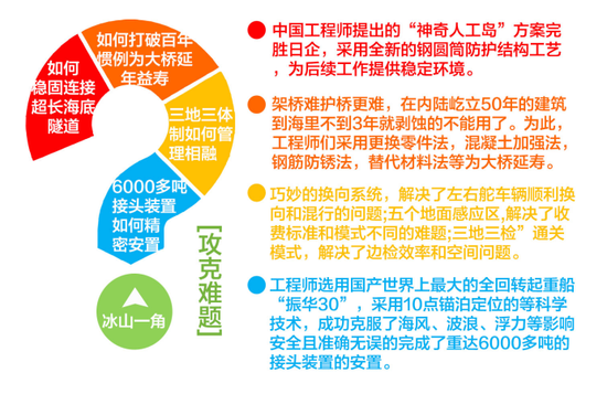 完胜日企方案的“神奇人工岛”:海底沉管隧道东西连接两个人工岛,是大桥的控制性工程之一。相比日本企业推荐的传统钢板桩方案,中国工程师提出的钢圆筒防护结构更胜一筹。这是一个大胆的构想,更是一项全新的工艺。这个方案不仅可以大大减少船机及海上作业的时间,大圆筒还有良好的稳定性和止水性能,为后续工作提供了一个稳定的环境。通过带波浪补偿器的钻机、勘察专用钻探平台等精细化勘探,使用8台振动锤穿越1600公里,吊起下沉120个500吨钢圆管,历经重重难关,终于完成任务不辱使命。