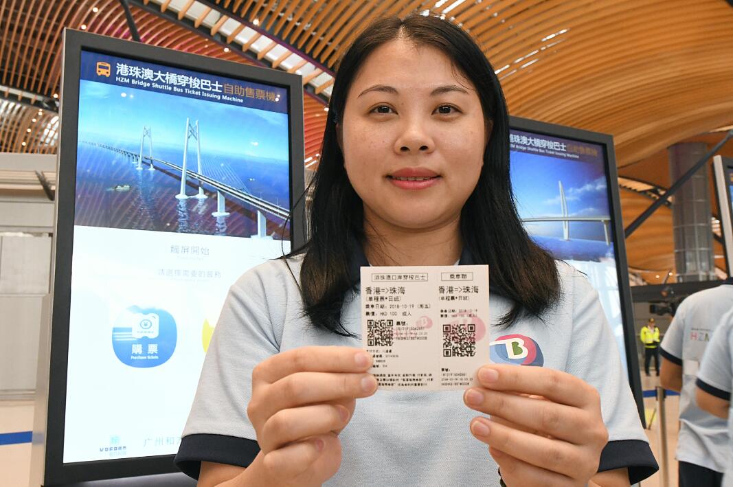 旅检大楼内直通巴士公司职员介绍车票。记者 冯瀚文摄
