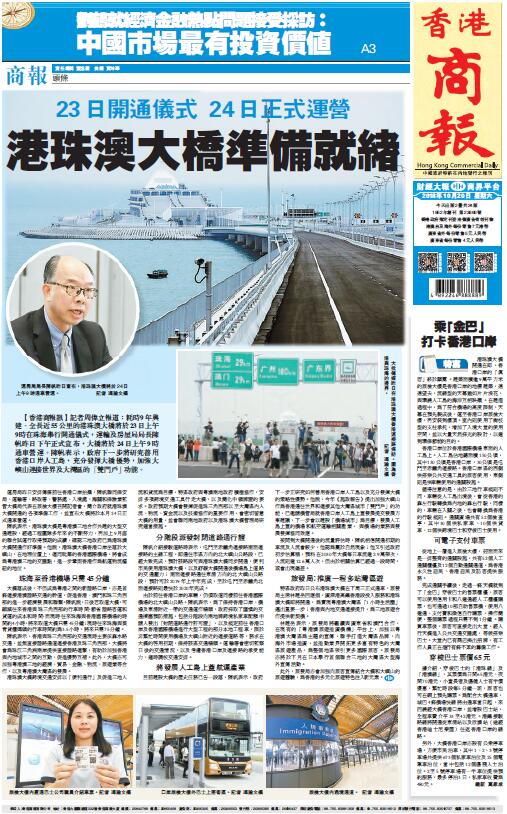 【香港商報网訊】記者周偉立報道:耗時9年興建、全長近55公里的港珠澳大橋將於23日上午9時在珠海舉行開通儀式,運輸及房屋局局長陳帆昨日下午正式宣布,大橋將於24日上午9時通車營運。陳帆表示,政府下一步將研究善用香港口岸人工島,充分發揮大橋優勢,加強大嶼山連接世界及大灣區的「雙門戶」功能。