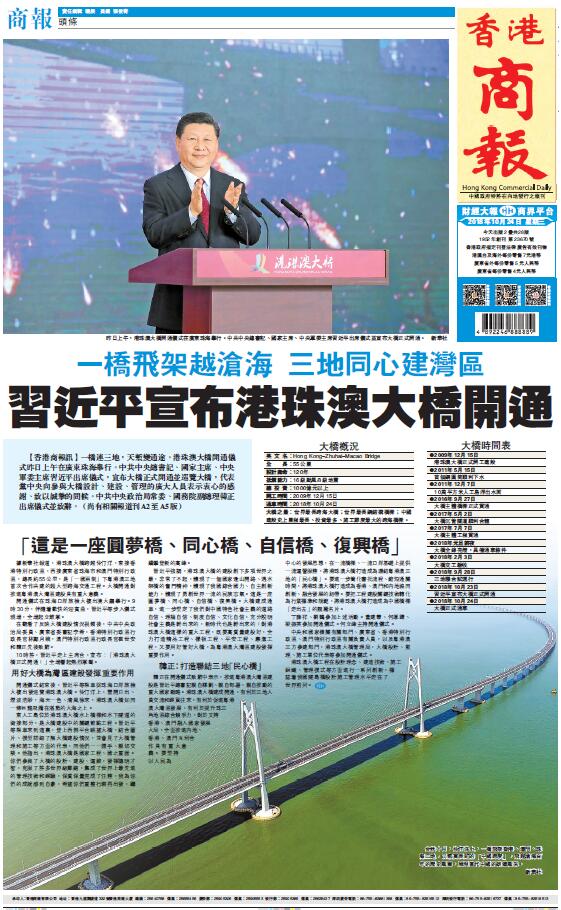 據新華社報道,港珠澳大橋跨越伶仃洋,東接香港特別行政區,西接廣東省珠海市和澳門特別行政區,總長約55公里,是「一國兩制」下粵港澳三地首次合作共建的超大型跨海交通工程。大橋開通對推進粵港澳大灣區建設具有重大意義。