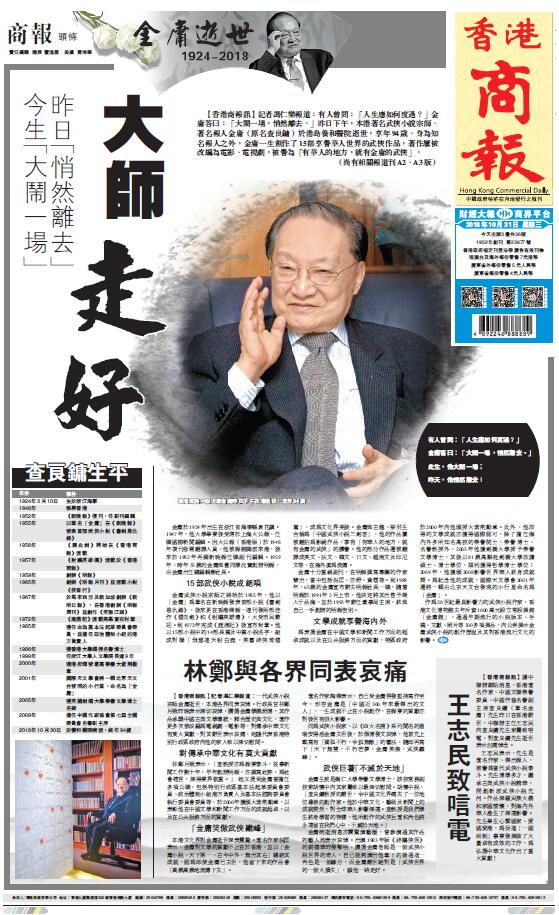 【香港商報網訊】記者馮仁樂報道:有人曾問:「人生應如何度過?」金庸答曰:「大鬧一場,悄然離去。」昨日下午,本港著名武俠小說宗師、著名報人金庸(原名查良鏞)於港島養和醫院逝世,享年94歲。身為知名報人之外,金庸一生創作了15部享譽華人世界的武俠作品,著作屢被改編為電影、電視劇,被譽為「有華人的地方,就有金庸的武俠」。