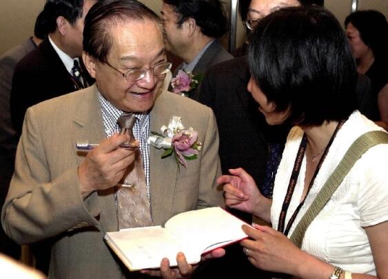 这是2001年7月22日,金庸(左)在2001香港书展上为读者签名留念。新华社
