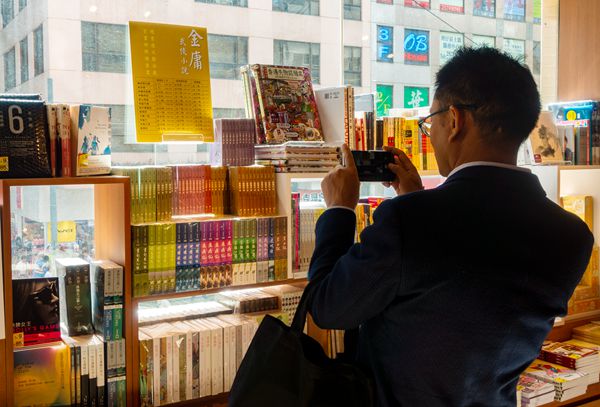 一名讀者在書店內金庸作品專櫃前拍照留念。
