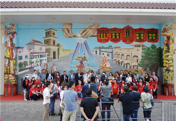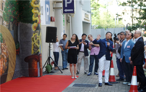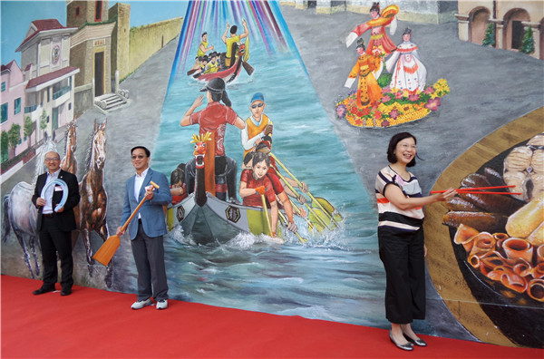 【香港商報网訊】記者周駿報道:以新界鄉情為主題的社群藝術彩繪將為27條鄉帶來新景象。10月6日,首幅大型壁畫「鄉情畫意」彩繪於沙田石門鄉議局大樓外牆展示,畫中以盆菜、龍舟、戲曲及賽馬等素材,傳遞新界傳統與現代結合的多元文化,當日,鄉議局主席劉業強、民政事務總署署長謝小華及賽馬會事務執行總監譚志源為壁畫添上最後一筆色彩,標誌該局成員、馬會義工及村民參與壁畫彩繪大功告成,同時,亦宣告由鄉議局舉辦、賽馬會贊助的「鄉情畫意」鄉郊彩繪計劃正式啟動並推廣至27鄉。