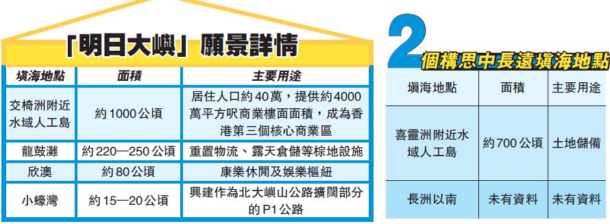 至於開支方面,該黨指,政府已表示「明日大嶼」願景跨越30年,將分階段進行,並首先研究交椅洲1000公頃填海。故認為不會在短期內或一次過耗費大量公帑,市民不須過度擔憂。