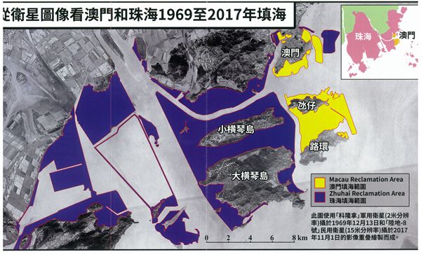 從衛星圖像可見本港由1969至2017年間之填海土地。