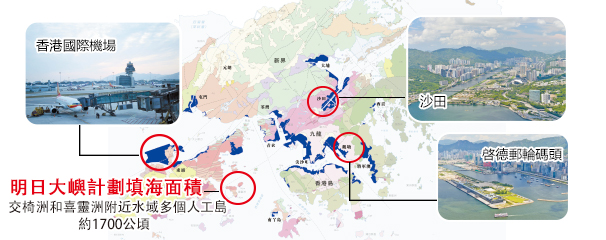 林鄭月娥施政報告提出的「明日大嶼願景」,涵蓋本港中部水域交椅洲和喜靈洲附近的人工島、大嶼山北岸和屯門沿海地帶,包括重新規劃後的內河碼頭區和龍鼓灘等多個發展區。其中,重點是在大嶼山中部海域填海建造約1700公頃的多個人工島,並配套建設連接屯門填海地帶、北大嶼山、中部水域人工島和港島北的主要運輸走廊。通過填海所得的土地儲備,可規劃興建26萬到40萬個住宅單位,滿足70萬至110萬人口的居住需求,其中七成用於公營房屋。填海計劃將於短期內啟動研究和設計工作,爭取2025年展開首階段填海,預計2032年首階段住宅單位可入夥。