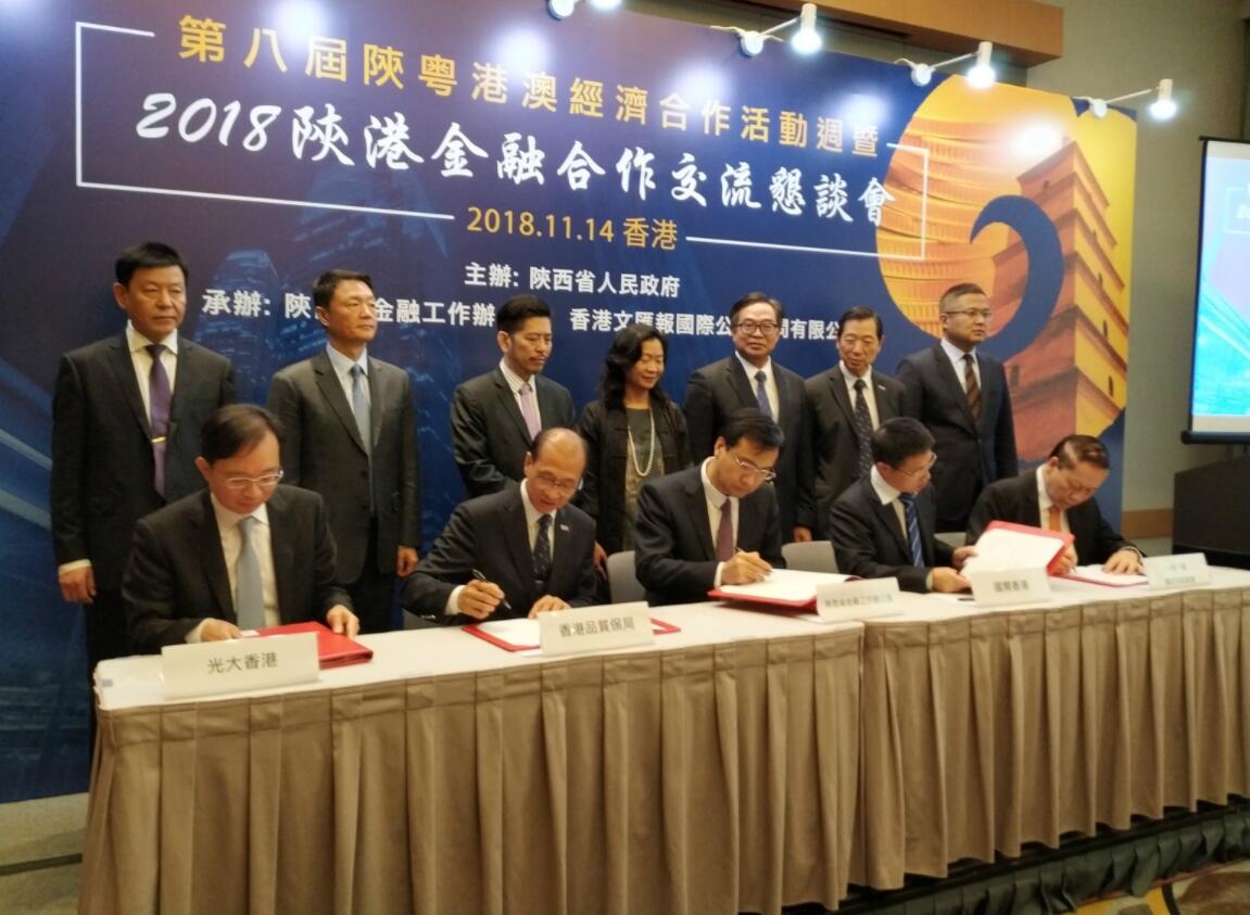 【香港商報網訊】記者傅博、胡秦玉報導:14日,2018陝港金融合作交流懇談會在香港會展中心舉行。陝港金融界精英濟濟一堂,共話兩地金融業深入合作。懇談會期間,香港品質保證局、國開行香港分行、光大銀行香港分行、“一帶一路”國際發展聯盟與陝西省金融辦簽訂了合作備忘錄。陝西省金融辦主任蘇虎超稱,金融交流為香港和陝西之間架起了一座絢麗的陝港合作大橋。
