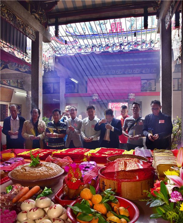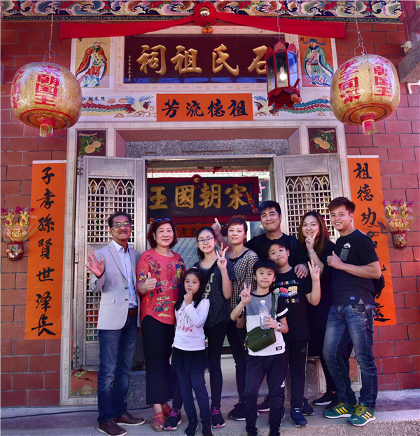 石氏祖祠外站着年輕下一代,祭祖讓他們認識自己的故鄉。祖祠內見宋朝國王大牌匾。