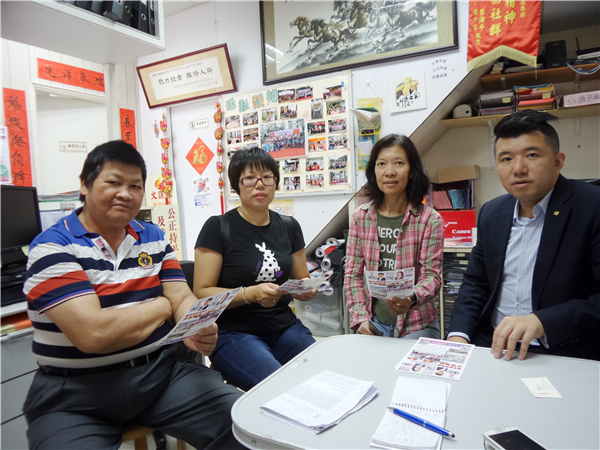 姚國威(右一)與天水圍北區街坊陳太(右二)、許太(右三)均表示,施政報告應於北區添設公眾街市惠及當區10萬基層人士。
