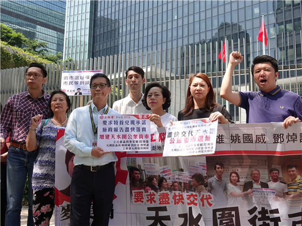 工聯會立法會議員麥美娟(右三)冀當局考慮類似大埔墟街市綜合大樓、熟食中心的形式興建,姚國威(右一)指天水圍北亦應興建公營街市。