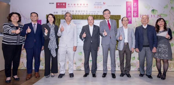 政務司司長張建宗 (中)及周大福慈善基金主席鄭家成(左四)與一眾主禮嘉賓同為水泉澳邨嘉頤薈護養院揭幕。