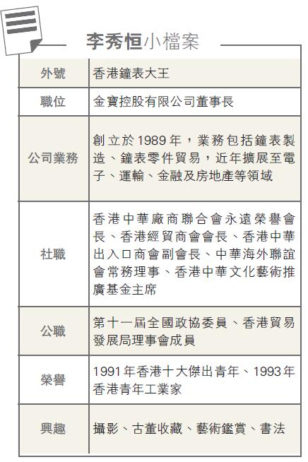 1980年代中後期,李秀恒在港的鐘表生意已很成熟,但他仍選擇北上發展鐘表業務,工廠主要設於深圳、東莞一帶,這亦是當時港資北上設廠的核心地帶。他表示,改革開放的前20年可被視為第一階段,那時內地土地多、勞動成本低,對環保方面沒有嚴格的要求,因此吸引大批港商北上打拼。根據國家商務部的統計,港澳投資一度佔內地吸引外資總額逾80%。於是,港式管理模式滲進內地,內地企業吸收了港資在營商上的法則、理念及種種優點。他稱:「改革開放起初十多年,可說是香港帶動內地的經濟發展,亦是香港企業帶領內地產品走向國際、走向文明的時期。」