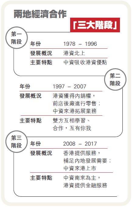 此時,中資企業亦開始來港發展。回歸後,中資以香港為平台實現了「走出去」,如華潤集團、中信泰富、越秀、越海集團等,這些企業都藉香港成功將業務範圍拓展到國外。李秀恒表示,港資和中資在此階段互相學習、互相合作,雙方借鑒了彼此的模式並相互需要,「中資需要香港作為平台,港資也需要內地的市場,大家在過程中充分交流」。