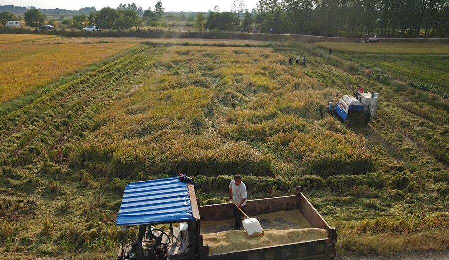 农民在安徽凤阳县小岗村一处稻田收割(9月27日无人机拍摄)。新华社
