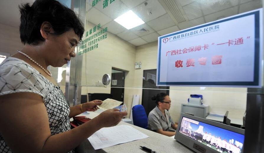 在广西壮族自治区人民医院,从北海到南宁异地就医的郑晓荣持社会保障卡在结算医药费(2015年6月30日摄)。新华社