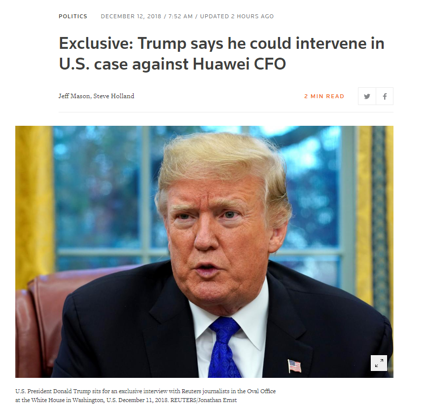 加拿大环球新闻网说,特朗普当日是在白宫接受路透社采访时回应孟晚舟在加拿大被拘押事件的。特朗普说,“如果我觉得这有利于国家,如果我觉得这有利于我们达成史上最大贸易协定,这很重要,有利于国家安全,我肯定会在我觉得有必要这样做的时候干预。”但文章没有说,特朗普所说的“干预”,具体指什么。