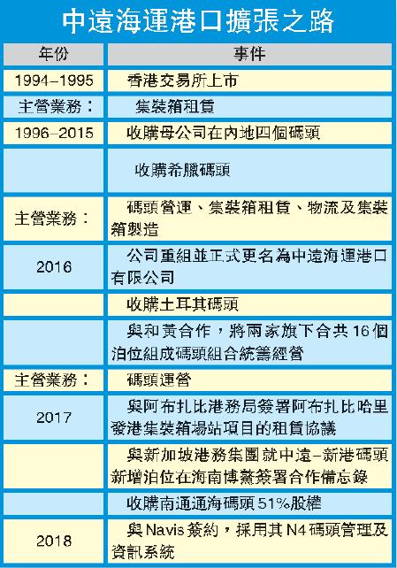 隨着改革開放擴展深入,中國對外貿易合作遍布世界各地,中遠海運港口亦積極拓展港口布局。2003年,與新加坡港口合作;2009年,到希臘收購碼頭;2016年,收購土耳其碼頭;2017年,又收購西班牙碼頭,進軍阿聯酋阿布扎比。黃天祐表示,未來海外港口布局亦將緊跟「一帶一路」,「有貨源就需要港口服務,所以中遠港口一定要走在船公司前面,以配合船公司的未來發展」。