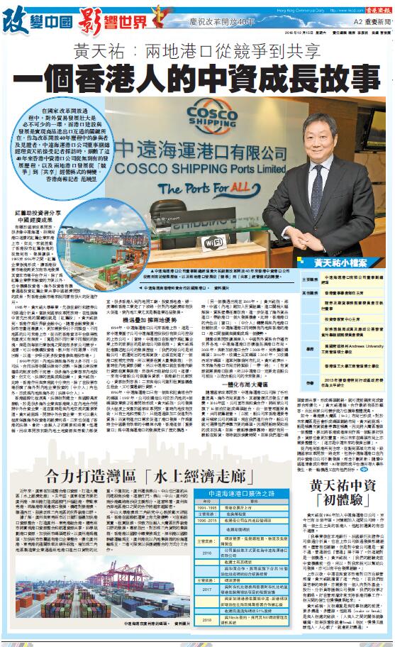 【香港商报网讯】記者范曉昱报道:在國家改革開放過程中,對外貿易發展壯大是必不可少的一環,而港口建設與發展是實現商品進出口互通的關鍵所在。作為改革開放40年歷程中的參與者及見證者,中遠海運港口公司董事副總經理黃天祐接受記者採訪時,細數了這40年來香港中資港口公司從無到有的發展歷程,以及兩地港口發展從「競爭」到「共享」經營模式的轉變。