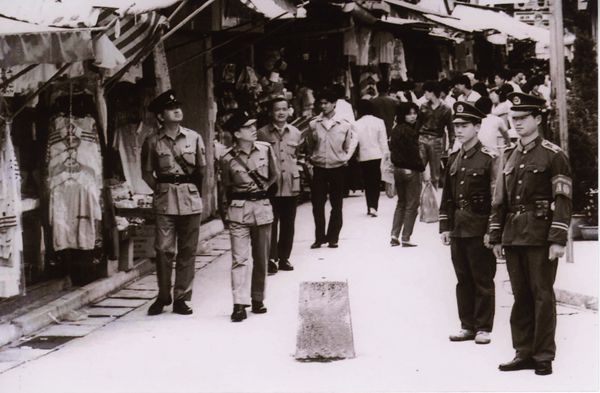 中英邊防警察在中英街巡視(左二為香港警官姚志明、右一為「沙頭角模範中隊」老兵鍾軍)。 何煌友攝于1985年