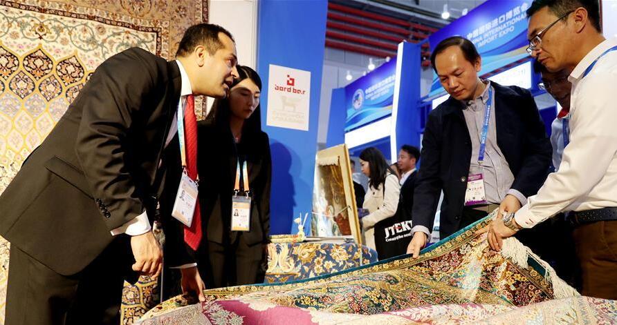 2018年11月5日,在上海举行的首届进博会上,一位来自伊朗的展商(左)向参观者介绍波斯地毯。新华社