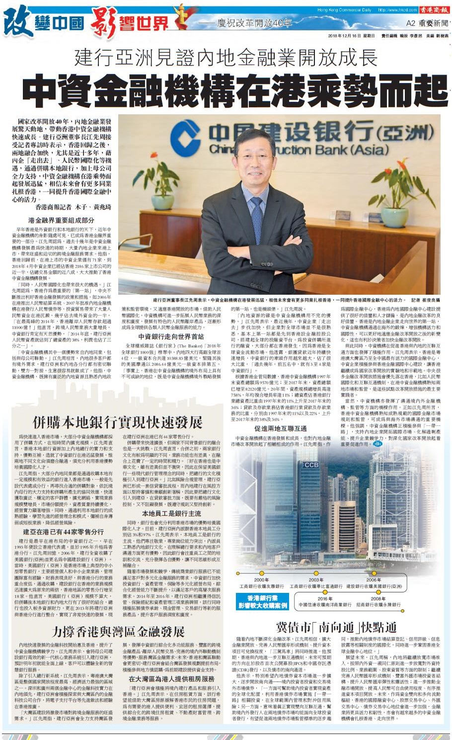 內地快速發展的金融科技開始惠及香港,提升了中資金融機構競爭力。江先周表示,會將母公司建設銀行高效的新一代核心業務系統引入建行亞洲,預計明年初就能全面上線,客戶可以體驗全新的智慧銀行服務。