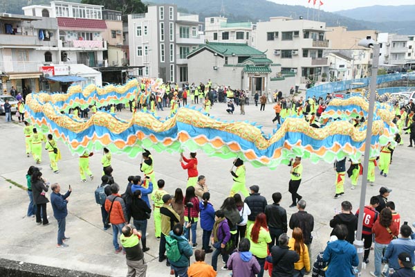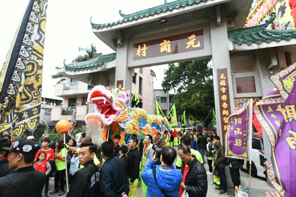 【香港商報網訊】八鄉元崗村每8年一次的太平清醮,重頭戲是12月10日的「行香」。行香,意謂進行打醮的村落,組織遊行的隊伍,配合金龍、醒獅、麒麟等,到本鄉及鄰近友好村落拜神進香,藉以睦鄰聯誼及祈求神恩庇佑。上午10時許數百名元崗村村民及遊客已齊集元崗牌樓前,由警方開路沿錦上路出發。彩旗打頭陣,村民抬着香亭,在喃嘸師傅、緣首和龍獅引領下,打鑼打鼓來到首站蓮花地。眾緣首參拜蓮花地社壇,蓮花地廣場舞出大龍和醒獅迎客,村民早已預備餅食及生果讓隊伍「醫肚」。第二站是上村八鄉古廟,大龍醒獅逐一向古廟內眾神參拜,最後沿錦上路折返元崗,結束歷時逾3小時的行香。