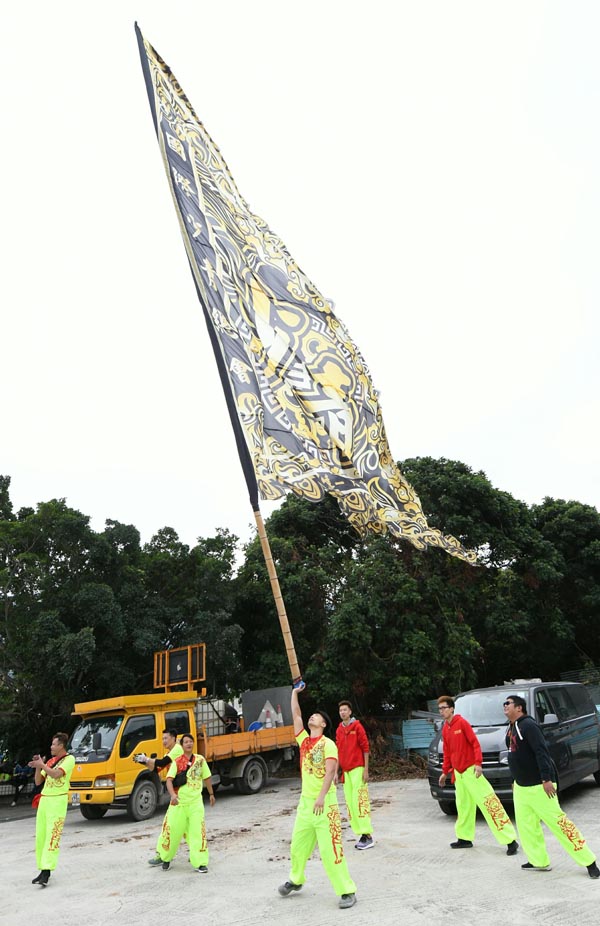 幾位壯丁比拼單手舉大旗。
