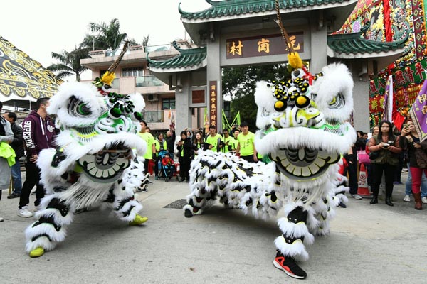 醒獅在村口靈活跳躍。