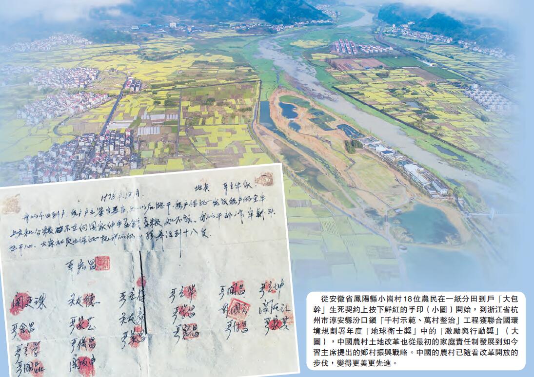 從安徽省鳳陽縣小崗村18位農民在一紙分田到戶「大包幹」生死契約上按下鮮紅的手印(小圖)開始,到浙江省杭州市淳安縣汾口鎮「千村示範、萬村整治」工程獲聯合國環境規劃署年度「地球衛士獎」中的「激勵與行動獎」(大圖),中國農村土地改革也從最初的家庭責任制發展到如今習主席提出的鄉村振興戰略。中國的農村已隨改革開放的步伐,變得更美更先進。