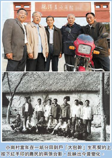 小崗村當年在一紙分田到戶「大包幹」生死契約上按下紅手印的農民的兩張合影,反映出今昔變化。
