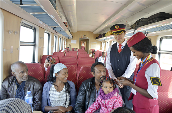 图说:中非合作「構建更加緊密命運共同體」,堪稱當今世界區域合作的范本。圖為列車員在中國援建的亞吉鐵路列車上核驗車票。