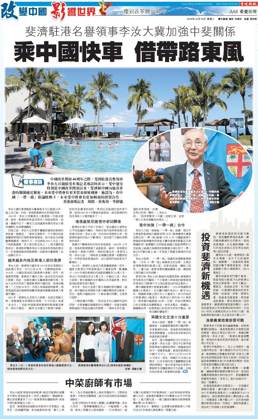 中國改革開放40周年之際,斐濟駐港名譽領事李汝大日前接受本報記者專訪時表示,斐中建交特別是中國改革開放以來,斐濟和中國內地及香港的關係越見緊密,未來斐中將會有更多貿易發展機會。他認為,在中國「一帶一路」倡議推動下,未來斐中將會有更加頻密的經貿合作。 香港商報記者 胡茵、黃兆琦、李靜儀