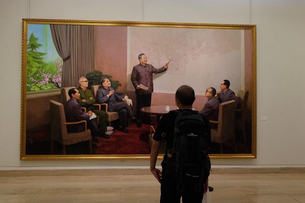 據有關史料,「經濟特區」之名為鄧小平所定,而「深圳市」這一名字則來自廣東改革開放的主要開創者、奠基人習仲勳。圖為在北京舉行的「大潮起珠江--慶祝改革開放40周年全國美術展」上,觀眾欣賞油畫作品《早春》(畫中左三為鄧小平,站立者為習仲勳)。