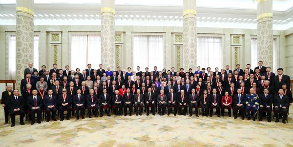 慶祝改革開放40周年大會結束後,習近平等中央領導同受表彰人員及親屬代表合影留念。 新華社