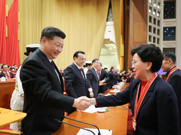 國家主席習近平為獲得改革先鋒稱號人員代表「『一帶一路』衛生領域合作推動者」陳馮富珍頒獎。 新華社