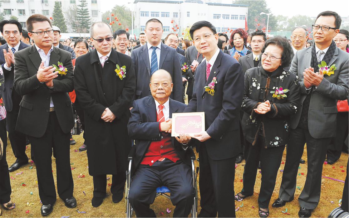 图说:曾憲梓(前左)情繫祖國,心繫家鄉,2011年,他出席捐建梅州教育及老人院等6項工程的剪綵奠基活動,獲梅州市梅江區負責人贈送紀念品致謝。 (新華社圖片)